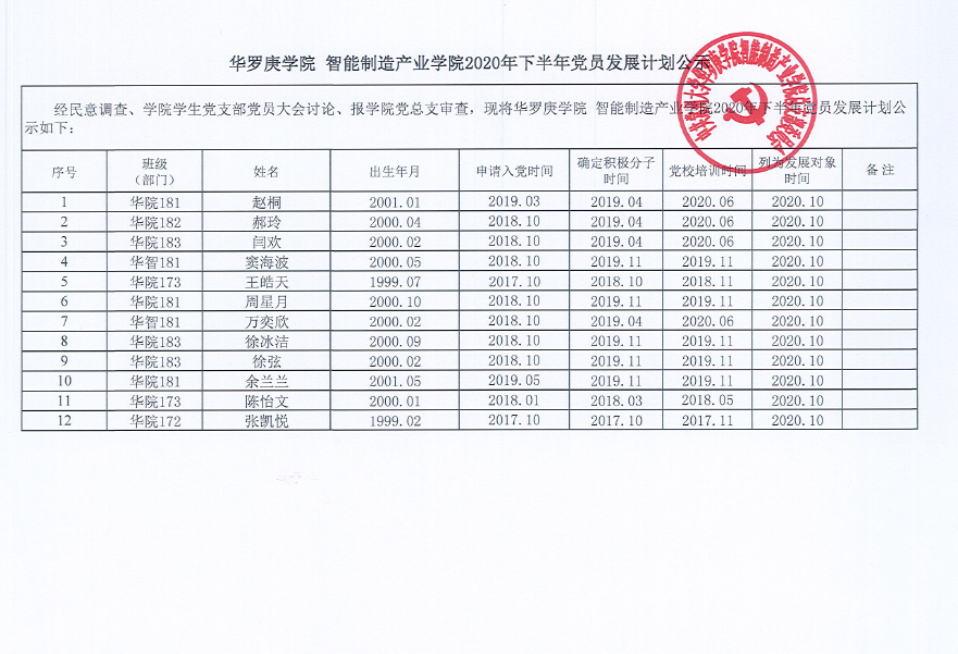 HoHoJ 智能制造产业学院2020年下半年党员发展计划公示
