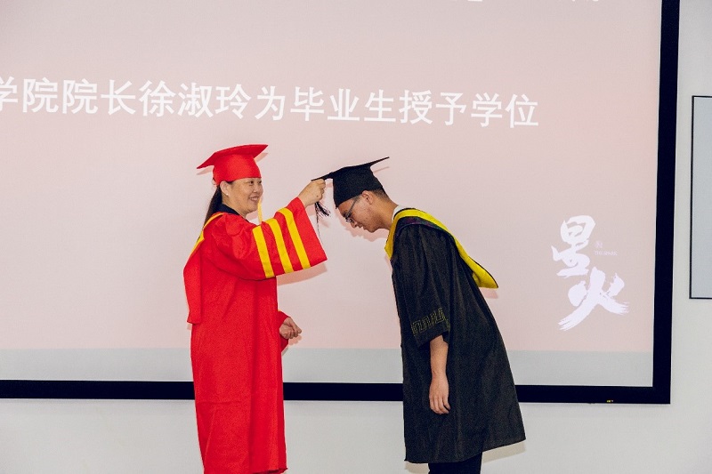 院长徐淑玲为全体毕业生一一拨穗正冠、授予学位。