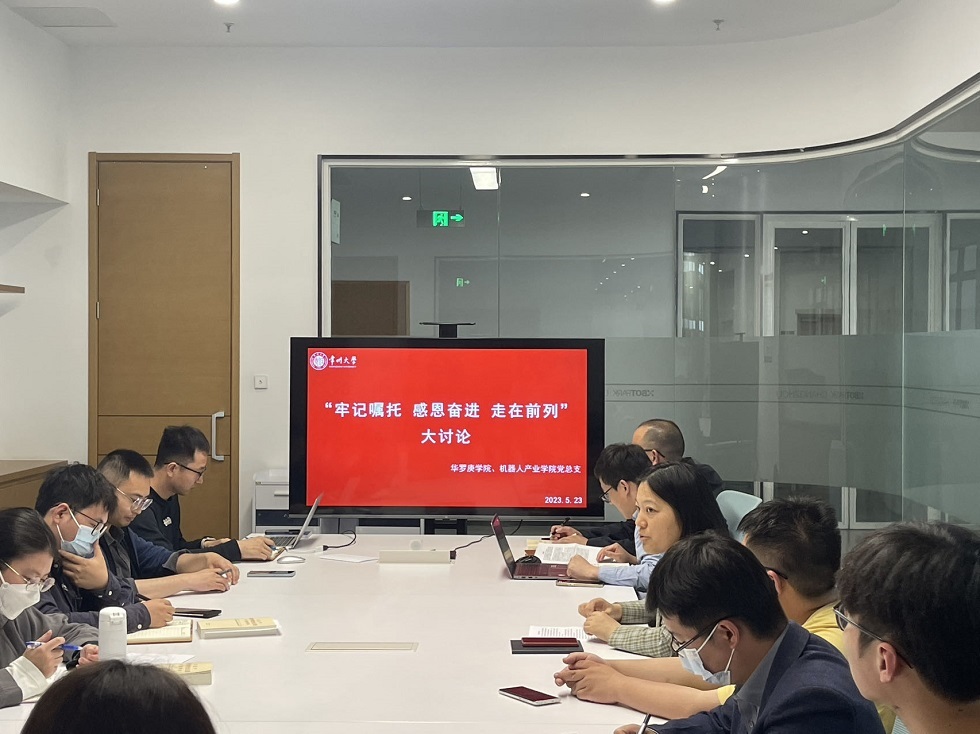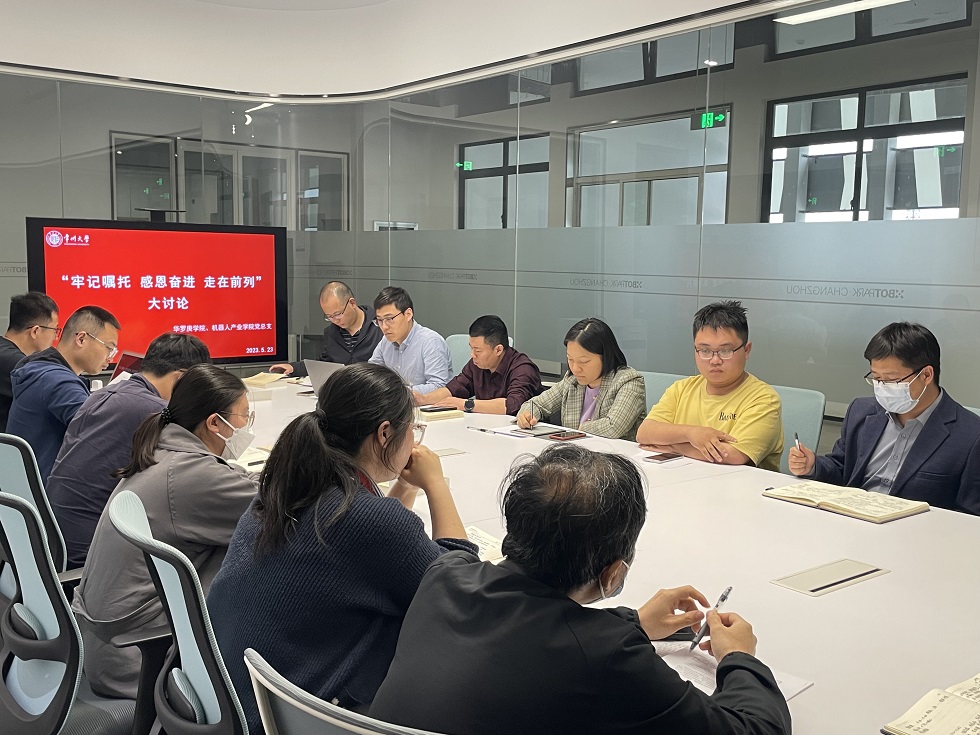 5月22日下午,HoHoJ 、机器人产业学院党总支开展“牢记嘱托、感恩奋进、走在前列”大讨论,深入学习贯彻习近平新时代中国特色社会主义思想,总结交流前一阶段学习和调研成果,努力以学铸魂、以学增智、以学正风、以学促干。会议由学院党总支书记宣慧主持,全体教师党员和部分学生党员代表参加讨论。