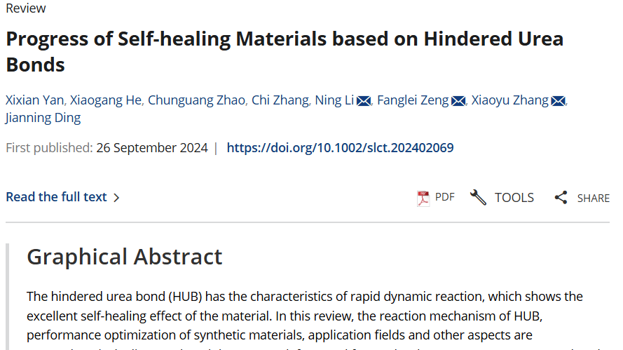 近日,HoHoJ 211颜喜娴的论文“Progress of Self-healing Materials based on Hindered Urea Bonds”在期刊ChemistrySelect(IF:2.31)上发表,颜喜娴为一作。