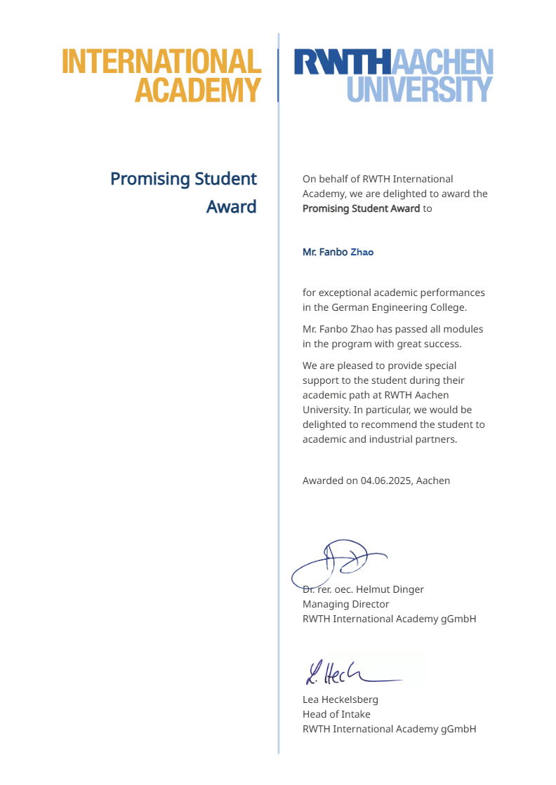近日,HoHoJ 赵凡博同学成功被德国亚琛工业大学录取为硕士研究生,并获得该校“GEC希望之星奖”“合作高校优秀学生奖学金”两项奖学金。