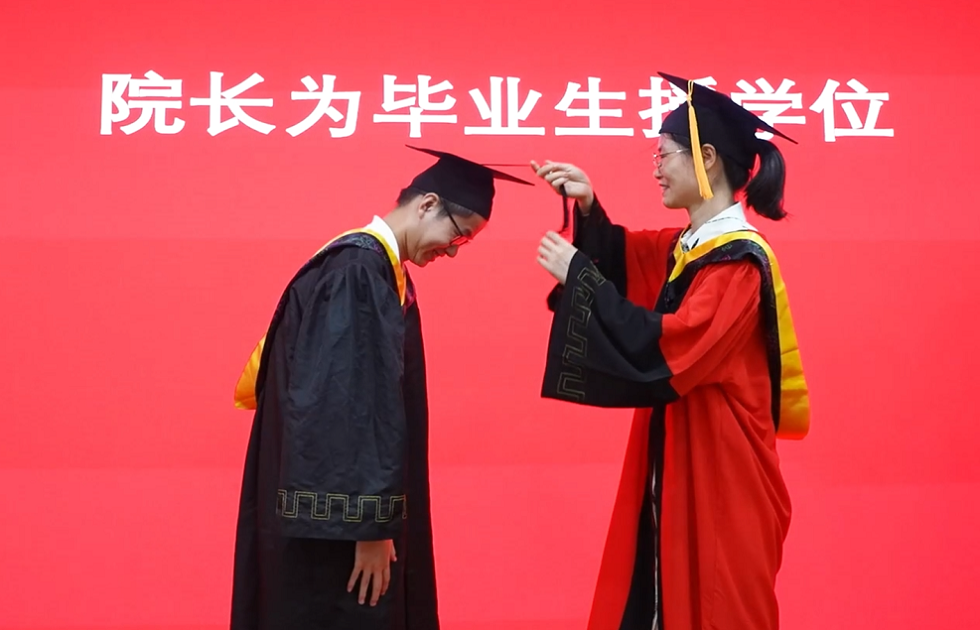 毕业典礼在庄严的国歌声中拉开帷幕。院长潘娜宣读学位授予决定,党总支书记宣慧宣读“校优秀毕业生标兵、优秀毕业生”表彰决定,副院长王欢宣读“学院荣誉毕业生”授予决定,副院长纪国剑宣读校友联络人聘任名单。与会领导为毕业生颁发荣誉证书、毕业纪念戒指和校友联络员聘书。