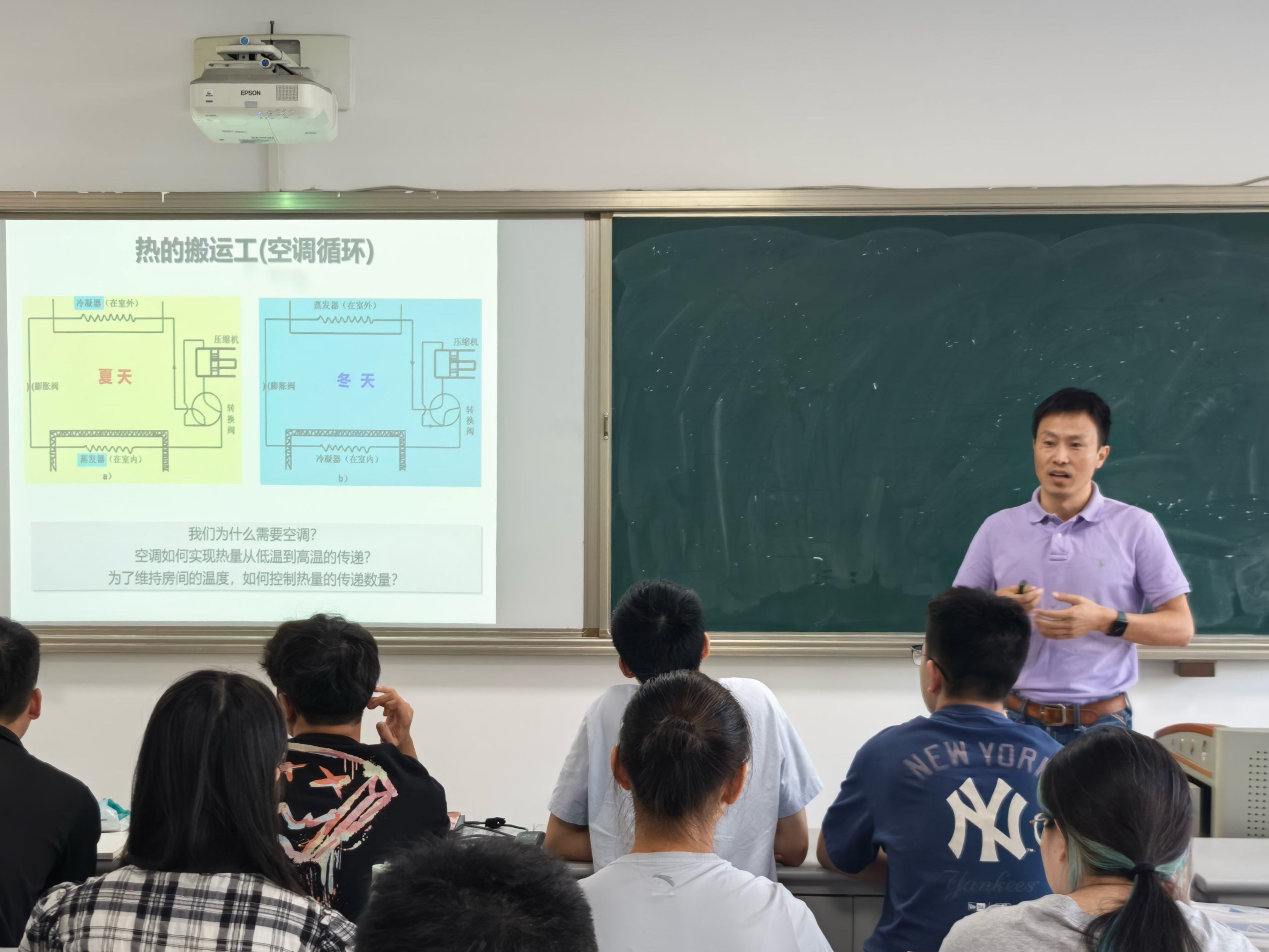 在应用讲解环节,李教授通过一系列生动案例,阐述了热力学原理在环保、材料、能源等领域的重要价值。他以空调循环——“热的搬运工”为例,从结构、公式与图像等多维度,系统解析了空调如何实现热量从低温向高温的传递与控制,让抽象的理论变得直观而生动。