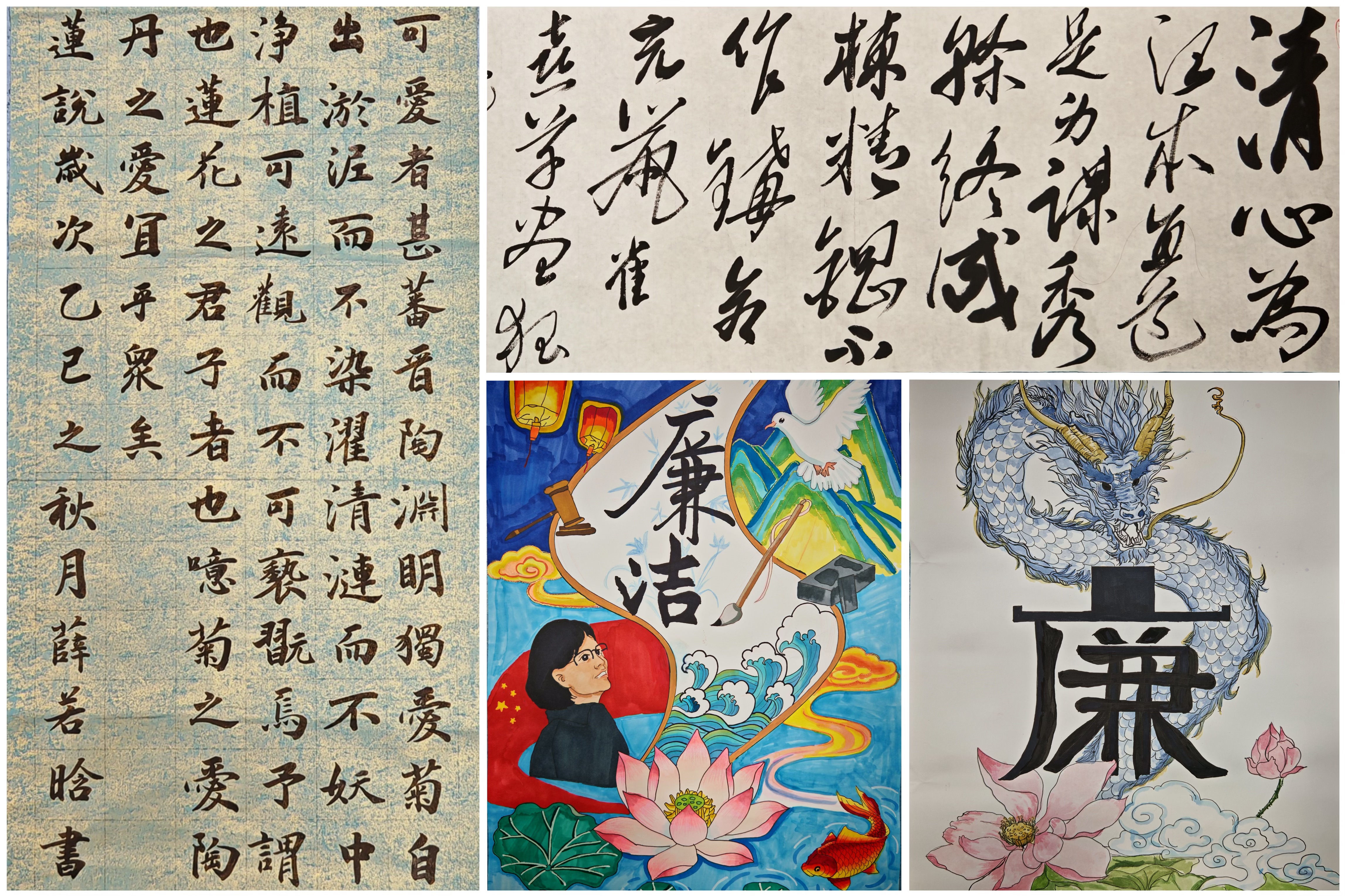 书法作品中,《书端州郡斋壁》以遒劲笔力书写“清心为治本,直道是身谋”,墨韵间传递刚正风骨;《爱莲说》则以清雅笔触诠释 “出淤泥而不染” 的高洁品格,让书法作品成为廉洁文化的载体。绘画类作品聚焦时代与传统的融合,一幅以张桂梅老师为核心的创作,搭配莲花、竹子等廉洁符号,展现新时代奉献精神;另一幅融合巨龙、莲花与 “廉” 字的作品,以鲜明意象构建廉洁画卷,极具视觉感染力。
