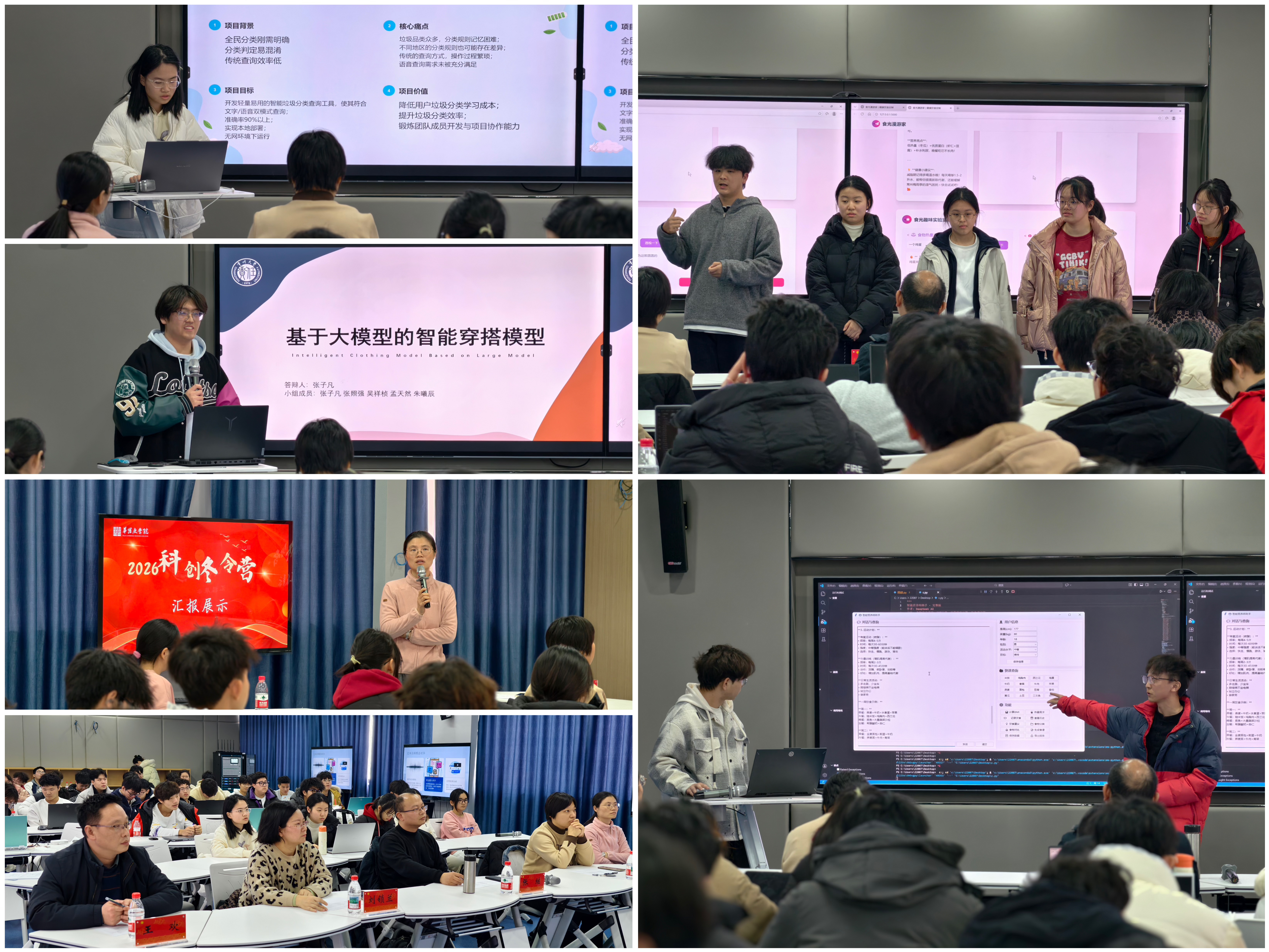 AI工程实战训练营则紧密对接人工智能发展趋势,围绕机器学习、大语言模型与AIGC技术应用等模块展开教学与实践。在跨学科导师指导下,学生系统学习技术方法,完成环境配置、数据分析与模型训练等基础实践,并通过跨年级组队方式围绕音乐生成、健康饮食、智能穿搭等具体场景,开展大模型应用的项目设计。训练营贯彻“学练结合、以赛促学”的理念,通过案例学习、小组协作与项目答辩,引导学生在实践中理解人工智能技术脉络,完成了从场景分析、技术选型到方案展示的全过程体验,为后续深入专业学习和参加竞赛积累了宝贵经验。