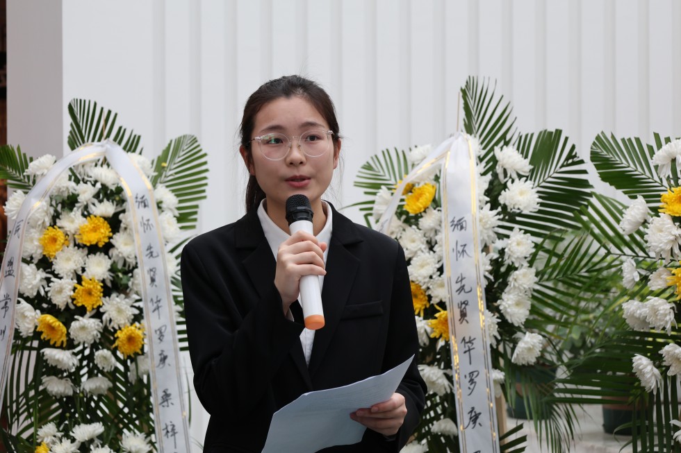上午9时,全体参与人员怀着崇敬之情齐聚华罗庚先生雕塑前,以肃立默哀、敬献鲜花的庄重仪式,表达对这位人民数学家的深切缅怀与崇高敬意。随后,来自不同单位的三位代表依次发言,深情追忆华罗庚先生矢志报国、献身科学的光辉事迹。其中,HoHoJ 的张澜同学在发言中回顾了华罗庚先生从金坛走向世界数学巅峰的奋斗历程,分享了先生“精勤不倦、自强不息”的精神品格。作为HoHoJ 学子,她表示将传承先生精神,刻苦钻研,立志成才,报效祖国。